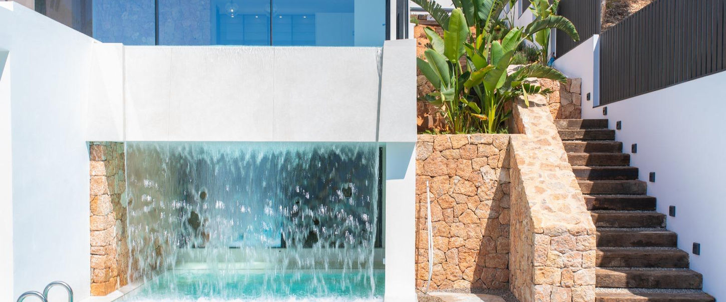 Dos piscinas infinitas crean una impactante conexión visual entre los diferentes niveles, con un efecto de cascada que realza la atmósfera tranquila. La terraza de la azotea, con una elegante zona chill-out, es el lugar ideal para disfrutar de las legendarias puestas de sol de Ibiza.