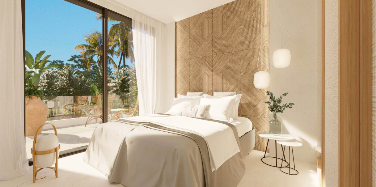 The development itself is carefully integrated into the landscape, featuring beautifully landscaped gardens, native Mediterranean vegetation, and natural materials such as traditional Ibizan stone used throughout the entrances and communal areas. These elements create a timeless aesthetic while respecting the natural environment and reducing water consumption.