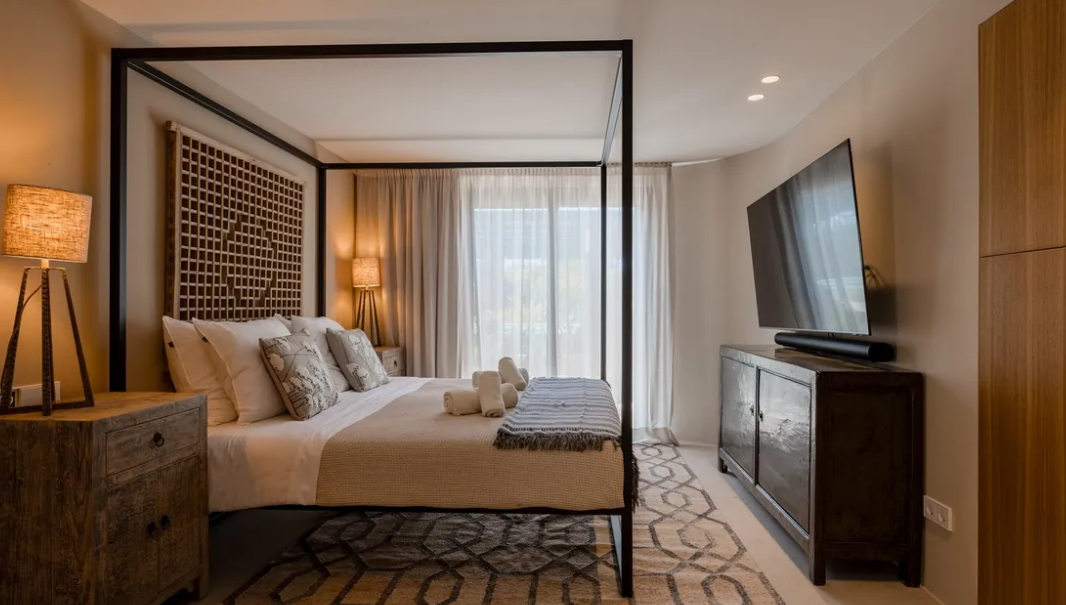 Inside, vast sliding doors fill the open-plan living space with sunlight. The kitchen pairs timeless timber cabinetry with warm-toned walls, integrated appliances, and a direct connection to the terraces beyond. In the living room, full-height glazing blurs the boundary between indoors and out, leading to a shaded terrace beneath Sabina beams – the perfect setting for al fresco dining beside the outdoor kitchen and pool.