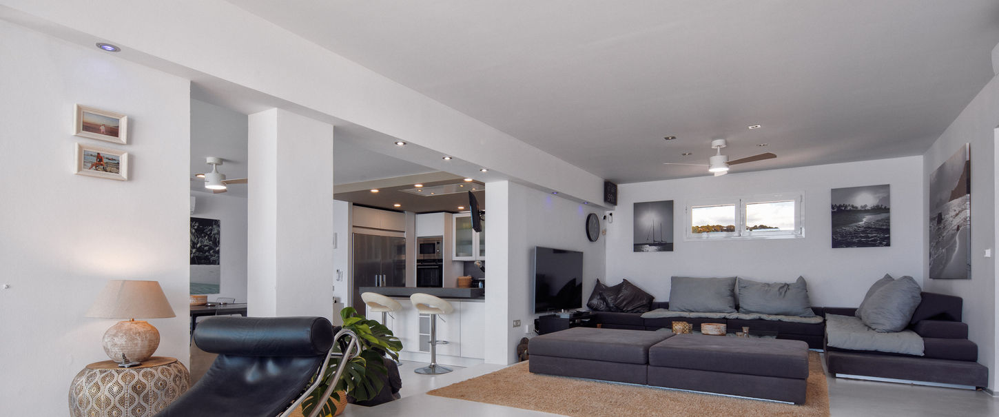 This modern penthouse, located in the prestigious Cala Sol building, sits directly on the beach of Cala Tarida. Perfect for those seeking either a holiday residence or a permanent home, it offers privileged sea views and direct access to the coastline.