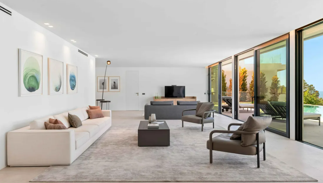 Perched high in the pine-clad hills above Cala Salada, this five-bedroom retreat is a masterclass in understated luxury, where light, landscape, and design converge in perfect harmony.