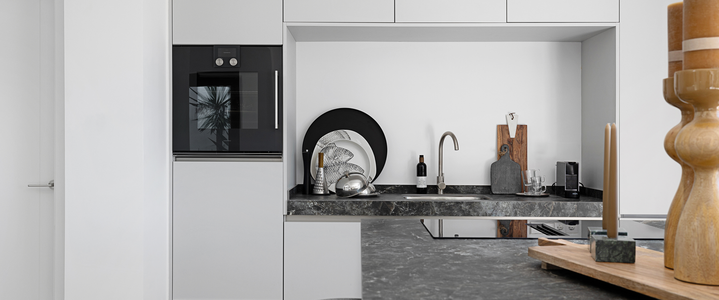 The fully equipped designer kitchen, complete with a natural stone bar, opens directly to the terrace—ideal for outdoor dining and Mediterranean living at its finest.